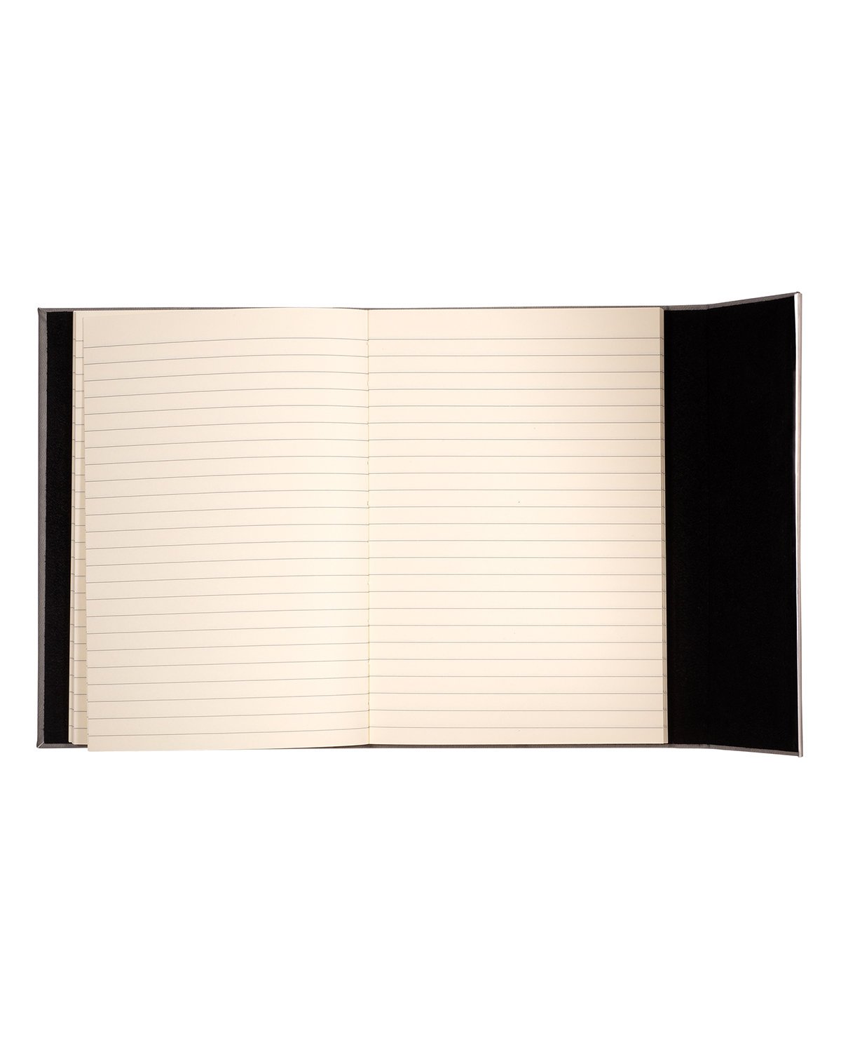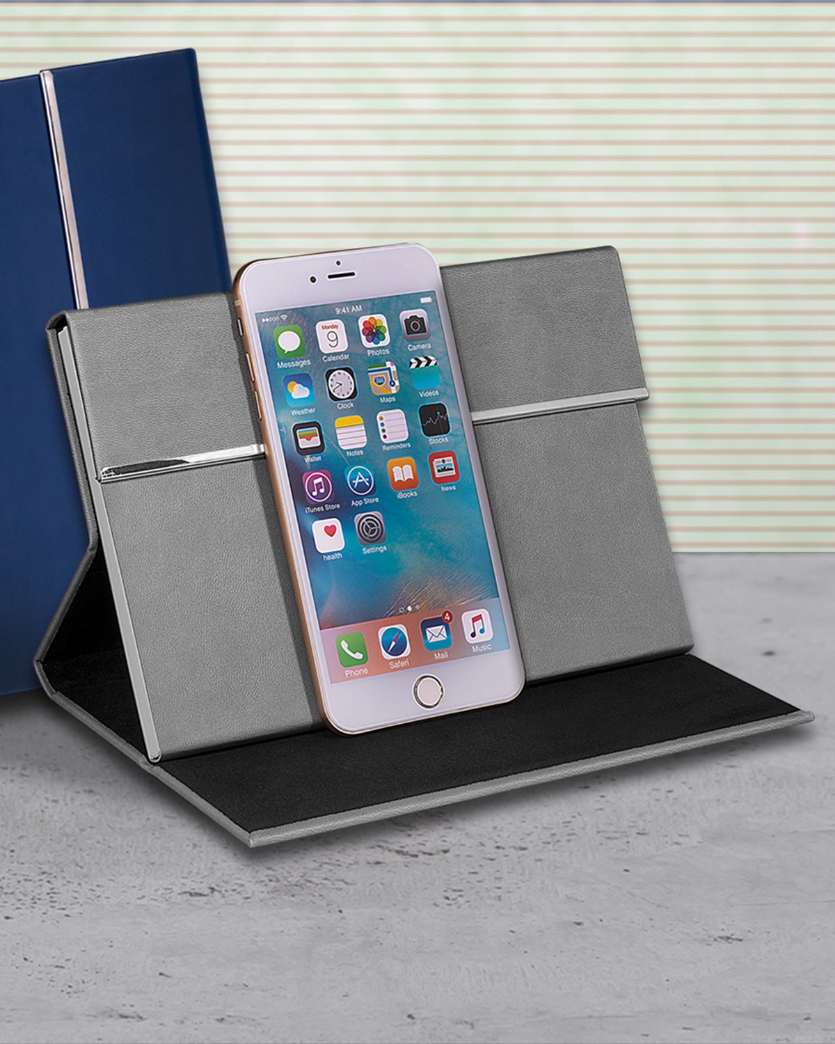 Journal cover folds to become mobile device stand for small tablets and smartphones. Includes 80 lined sheets of 80g cream paper, not refillable. 5.7500″ W x 8.2500″ H x 0.7500″ D